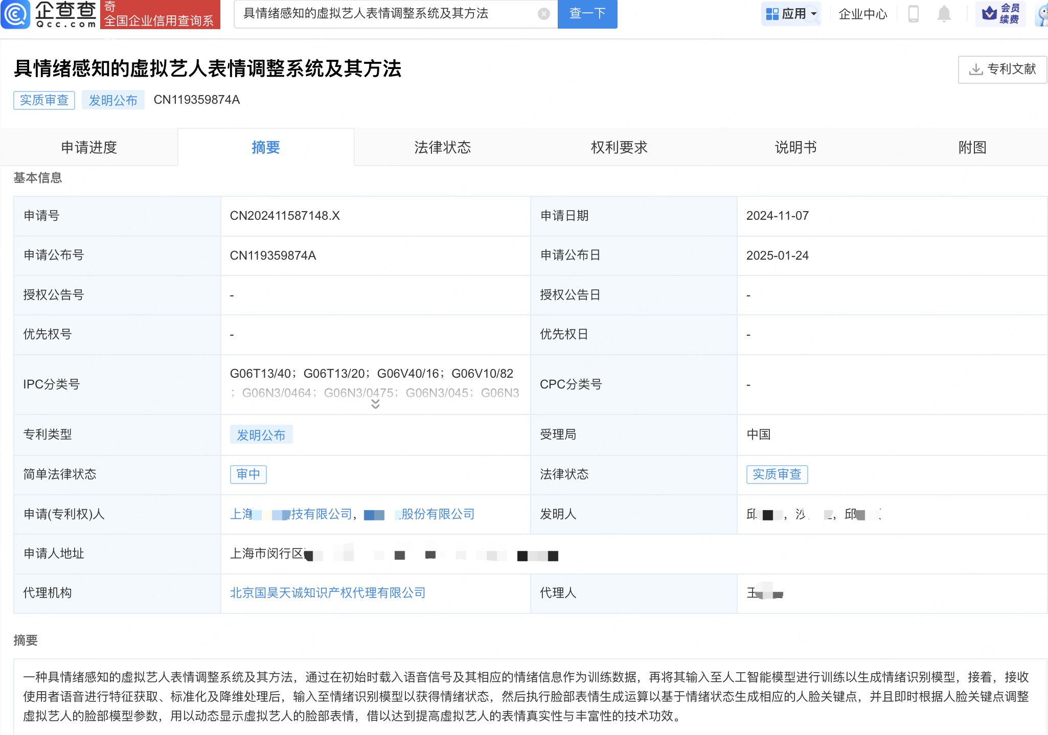 近日,AI艺人相关话题引发热议。已有公司申请“具情绪感知的虚拟艺人表情调整系统及其方法”专利。企查查专利摘要显示,该方法通过在初始时载入语音信号及其相应的情绪信息作为训练数据,再将其输入至人工智能模型进行训练以生成情绪识别模型,接着,接收使用者语音进行特征获取、标准化及降维处理后,输入至情绪识别模型以获得情绪状态,然后执行脸部表情生成运算以基于情绪状态生成相应的人脸关键点,并且即时根据人脸关键点调整虚拟艺人的脸部模型参数,用以动态显示虚拟艺人的脸部表情,借以达到提高虚拟艺人的表情真实性与丰富性的技术功效。